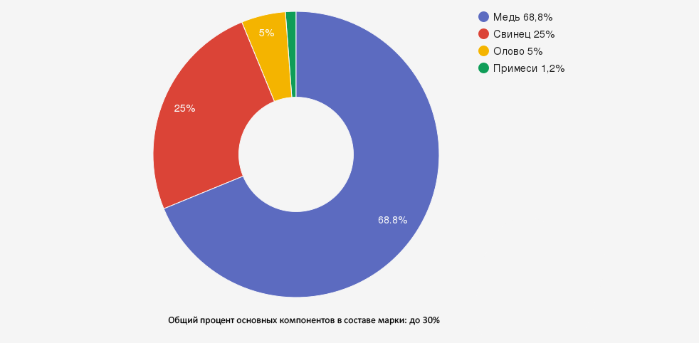 Медь как основной элемент сплава в маркировке не указывается, поскольку подразумевается, что она составляет основу любой бронзы. В данном случае содержание меди составляет примерно 70%, что определяется как остаток после учета легирующих элементов и допустимых примесей.